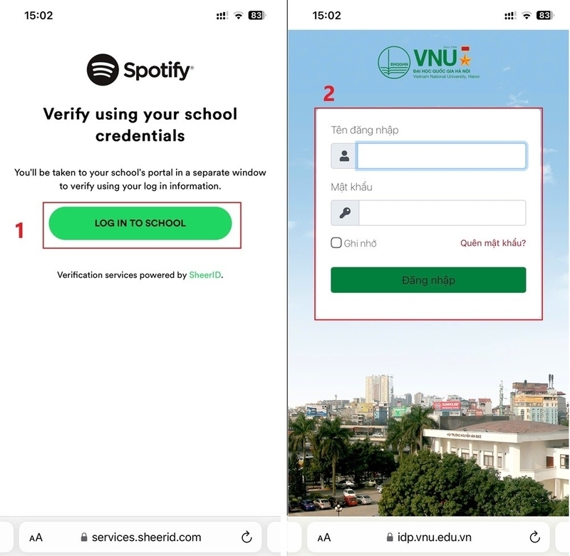 - Sau khi chọn vào Verify my student status, bạn sẽ được đưa sang giao diện đăng nhập email trường để xác minh tư cách mình là sinh viên của trường. Hãy chọn vào Log in to school, sau đó điền tên đăng nhập, mật khẩu và nhấn vào Đăng nhập.