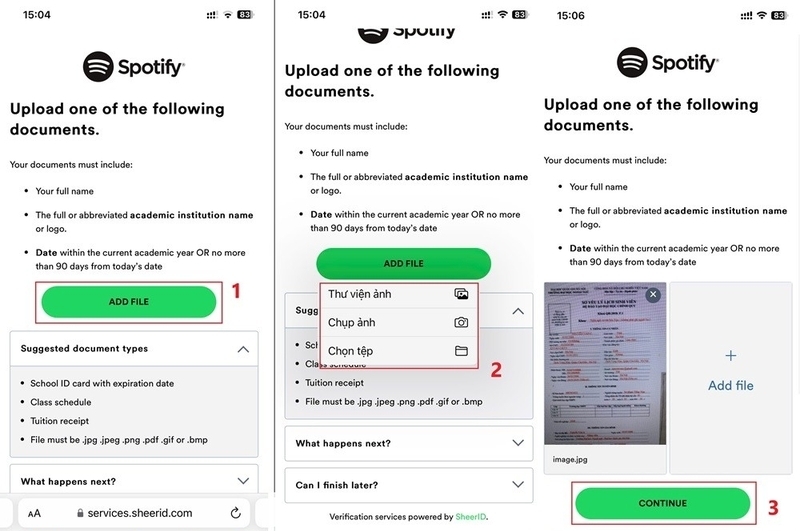 - Lúc này, bạn sẽ được đưa đến giao diện upload file thông tin chứng minh mình là sinh viên (thẻ sinh viên, bảng điểm, phiếu đóng học phí, v.v.). Hãy nhấn chọn Add file (bạn có thể chọn tải tài liệu qua Thư viện ảnh, qua tệp hoặc chụp trực tiếp) rồi nhấn Continue.