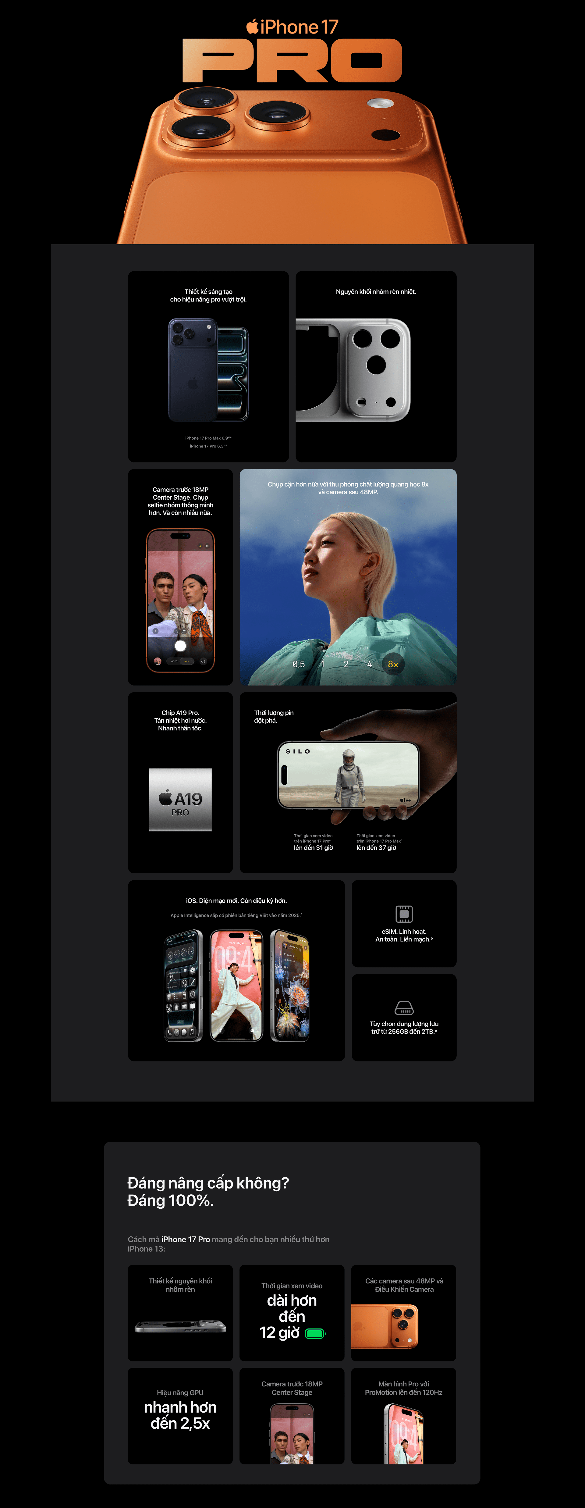 Chip A19 Pro, CPU 6 lõi với 2 lõi hiệu năng và 4 lõi tiết kiệm điện, GPU 6 lõi với Neural Accelerator, Neural Engine 16 lõi, Công nghệ dò tia tốc độ cao bằng phần cứng |