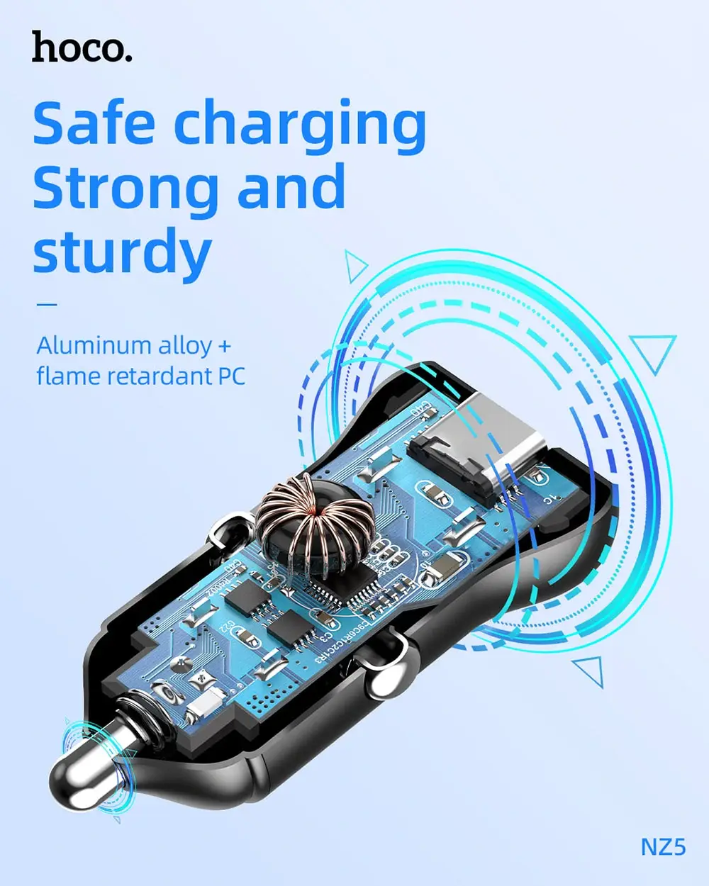 - Tẩu sạc nhanh Hoco NZ5 đến từ thương hiệu Hoco nổi tiếng, được trang bị 2 giao diện đầu ra hỗ trợ sạc 2 thiết bị cùng lúc. Công suất tối đa có thể lên tới 30W, giúp rút ngắn thời gian sạc. Bên cạnh đó sản phẩm được trang bị nhiều tính năng bảo vệ, đảm bảo an toàn cho người dùng.