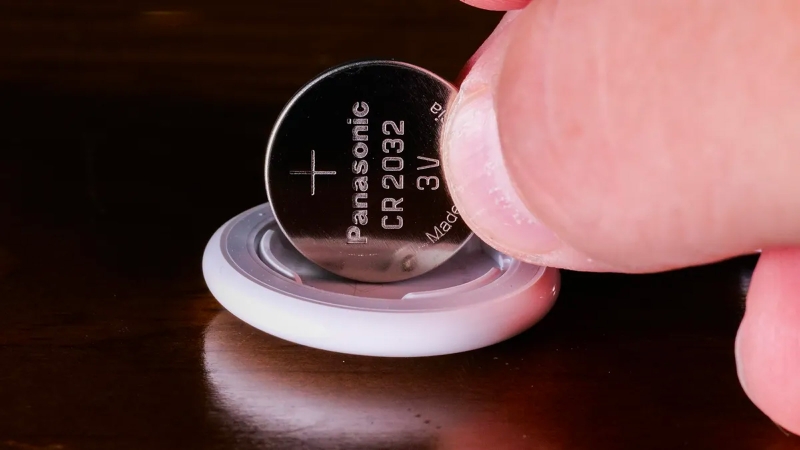 - Lắp pin mới vào, đảm bảo mặt cực dương (+) hướng lên trên. Khi lắp đúng, AirTag sẽ phát ra âm thanh xác nhận.